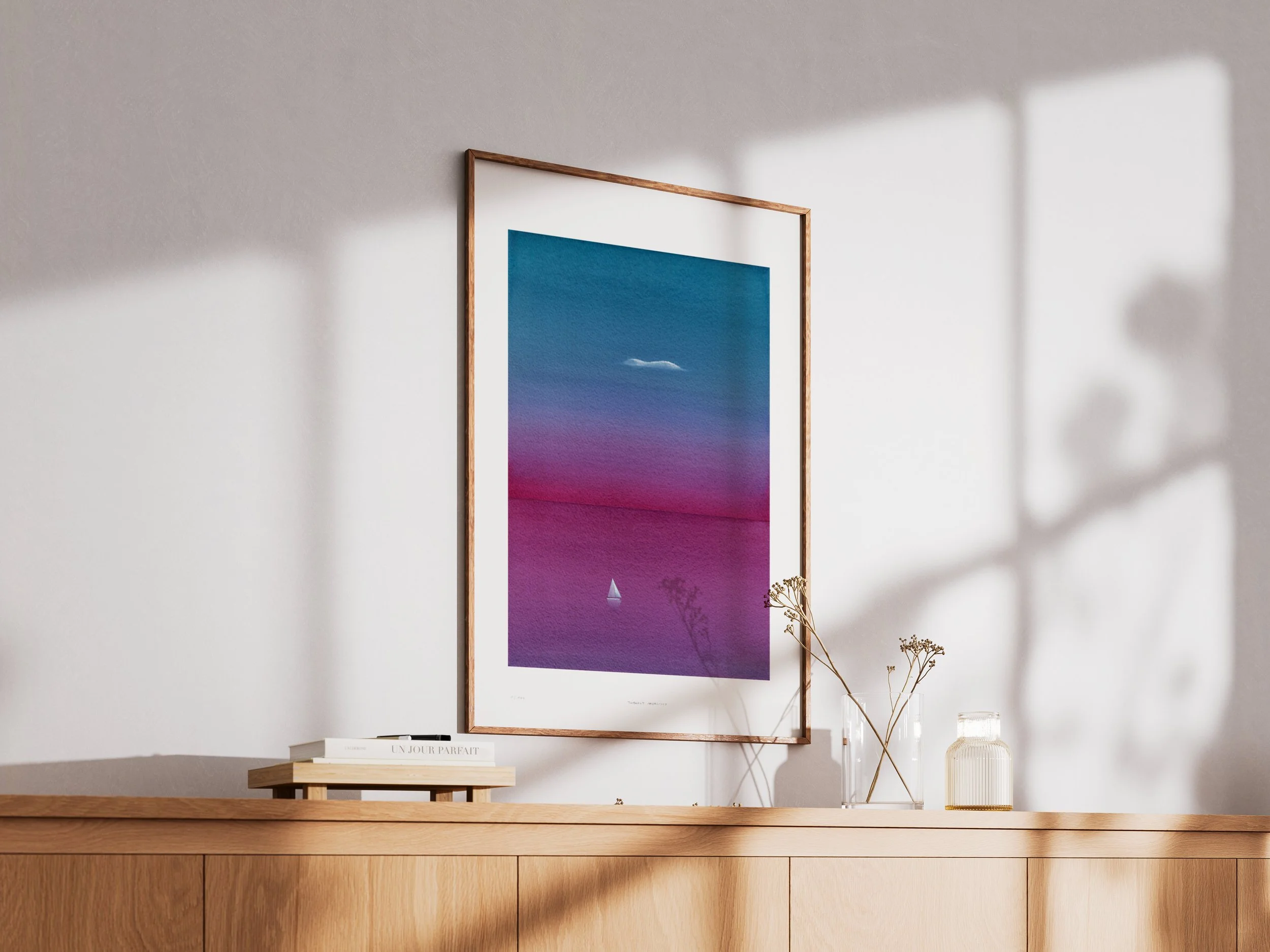 Une sélection de mes peintures est disponible dans divers formats à la SLOW Galerie. Sur cette page vous pouvez commander des tirages en édition limitée au format A2 de la série “Le large”, et des petits formats d’autres séries.